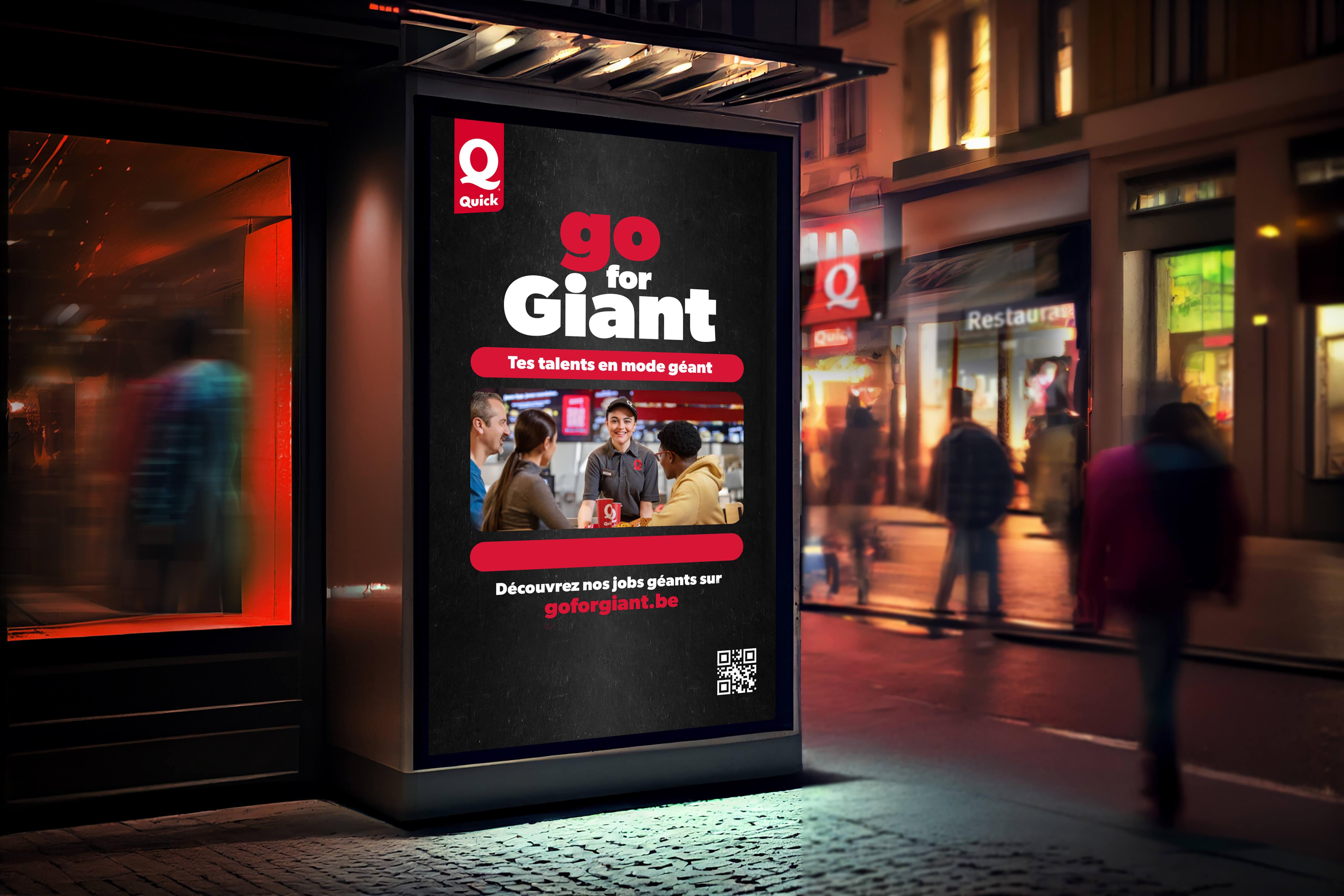 Nous aussi, nous avons vu grand. Le résultat ? Une campagne de marque employeur savoureuse avec une ligne courte et percutante : « Go for Giant ». En plus de ça, des éléments graphiques dynamiques et reconnaissables, se fondant bien dans le rouge emblématique de Quick. Pour les visuels clés et les vidéos, nous avons dû tourner la nuit. Eh oui, Quick n’arrête jamais !