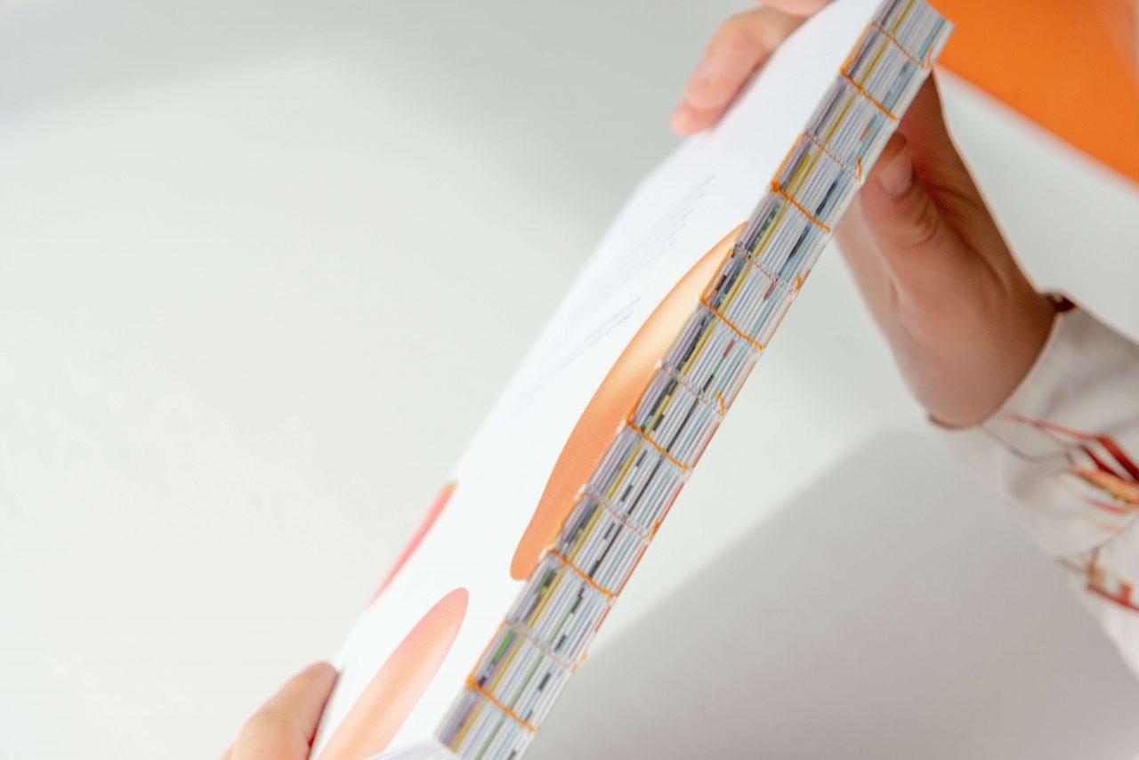 Morgen op het Menu is niet alleen organisch qua design. De cover is gemaakt uit afvalresten van maïs en de gekleurde pagina’s binnenin hebben een artisanale look. Het boek is samengebonden met een oranje draad, wat verwijst naar de bekende ING-leeuw.